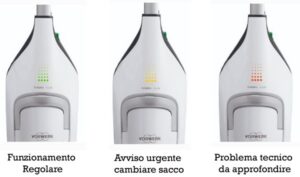 Il sacco filtrante si cambia quando è pieno, ovvero quando si ostruisce diminuendo sensibilmente la capacità di aspirazione. Sarà buona norma cambiarlo comunque prima che si ostruisca completamente e si accendano, le spie di segnalazione. Il sacco parzialmente ostruito, comunque sforza il motore, quindi è meglio cambiarlo non oltre i due mesi.